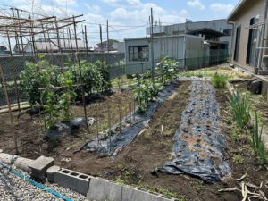 デイのちっこい畑 今日は、 デイサービスセンターめぐるはお休みです。 デイのこざえん(ちっこい畑)には、 気持ち良い風が そよそよとふいてます。 老人ホームの畑は、 2反ほどあるので 給食用の野菜はそちらに。