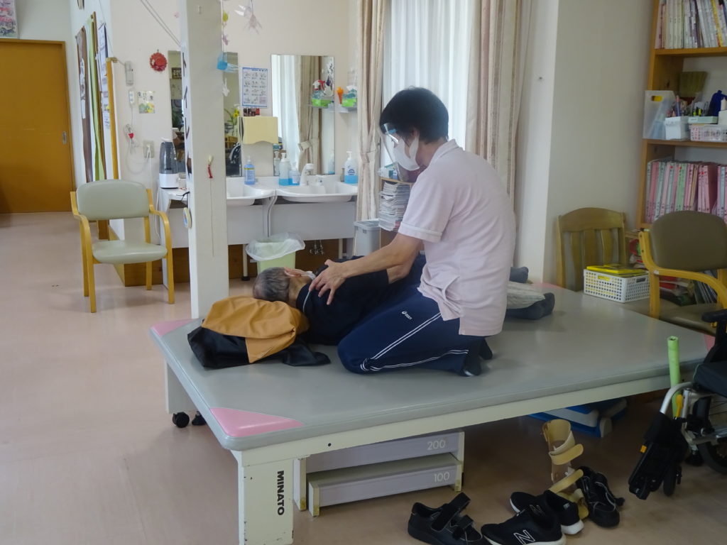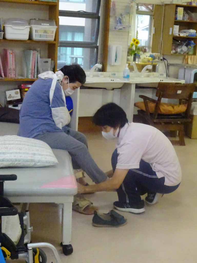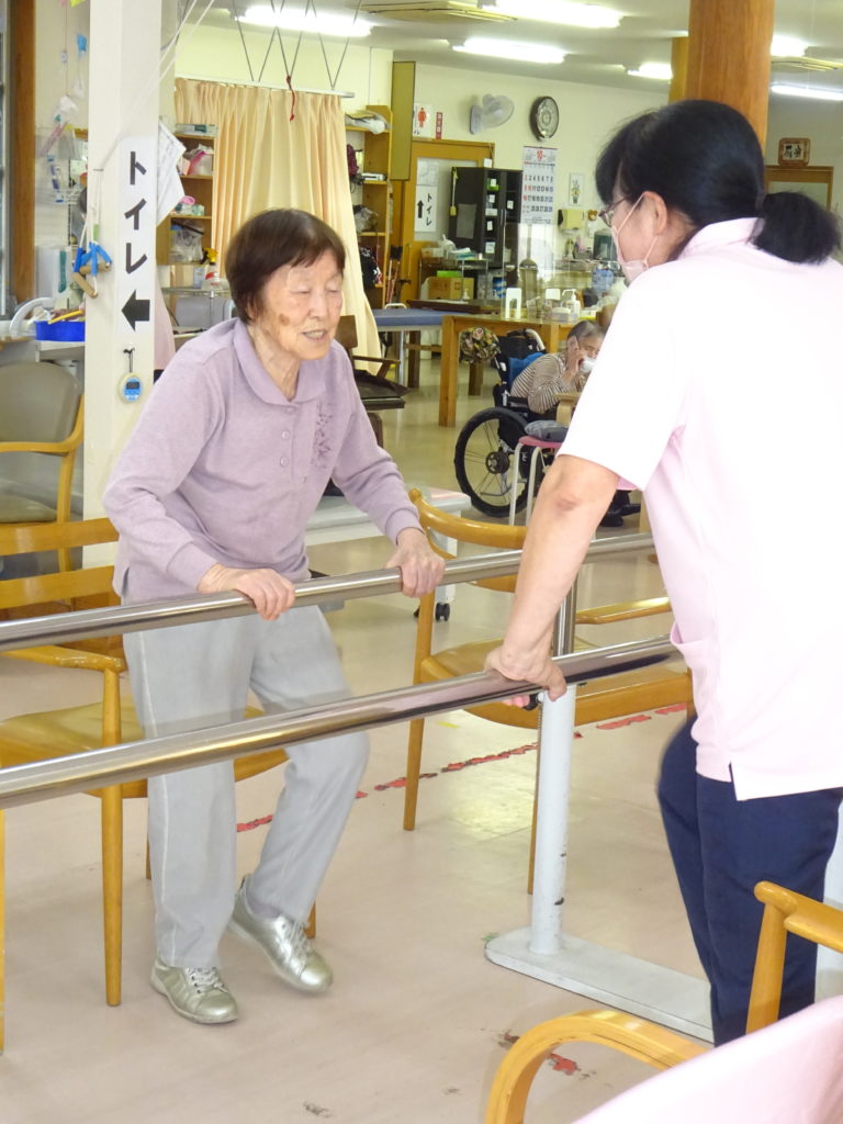 高齢者は下肢筋力が弱くなることにより、日常生活でに転倒し骨折につながることがあります。デイサービスセンターめぐるでは、骨折した方の回復期のリハビリテーションを行っています。また、下肢筋力強化を図りながら、身体の活動性を向上させることを目的とした転倒予防のための教室や、居住環境の整備のアドバイスもしています。